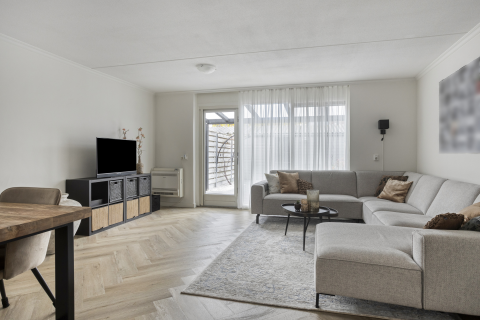 De woonkamer heeft een praktische L-vorm en een royale oppervlakte van 29 m². Er is genoeg ruimte voor een grote hoekbank, meerdere kasten én een speelplek voor de kinderen. De vloer is afgewerkt met laminaat, de wanden zijn gespoten en het plafond is voorzien van een sierlijst in combinatie met spuitwerk.